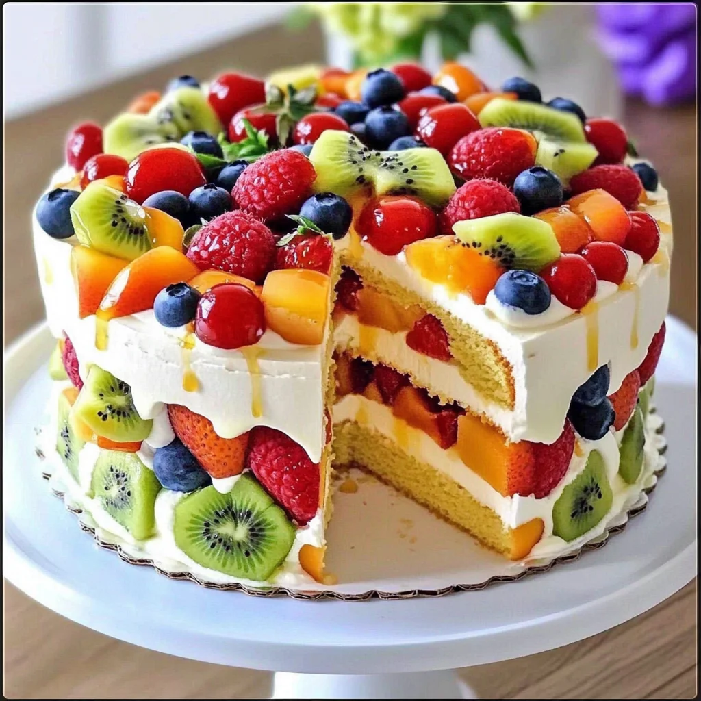 Imagine slicing into a vibrant cake with fruit, where juicy berries and succulent slices of tropical delights burst forth, filling the air with an irresistible sweetness. The soft, fluffy layers beckon, each bite a tantalizing dance of flavors that transports you to sun-soaked picnics or festive gatherings, making every moment a reason to celebrate.
