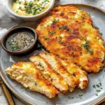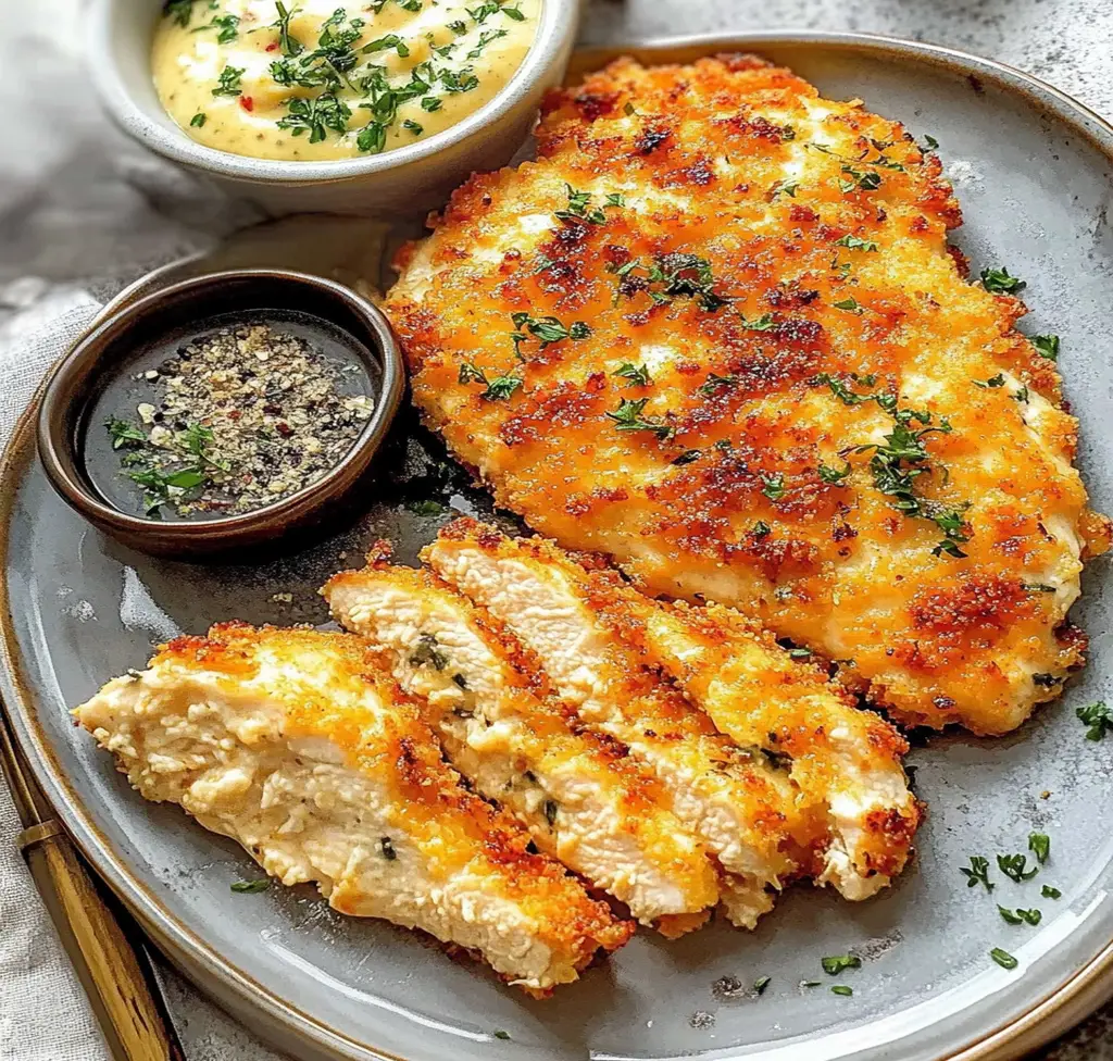 Dunk each seasoned chicken breast into the breadcrumb mixture until they are fully coated. Don’t skimp here; we want every inch covered in cheesy goodness!