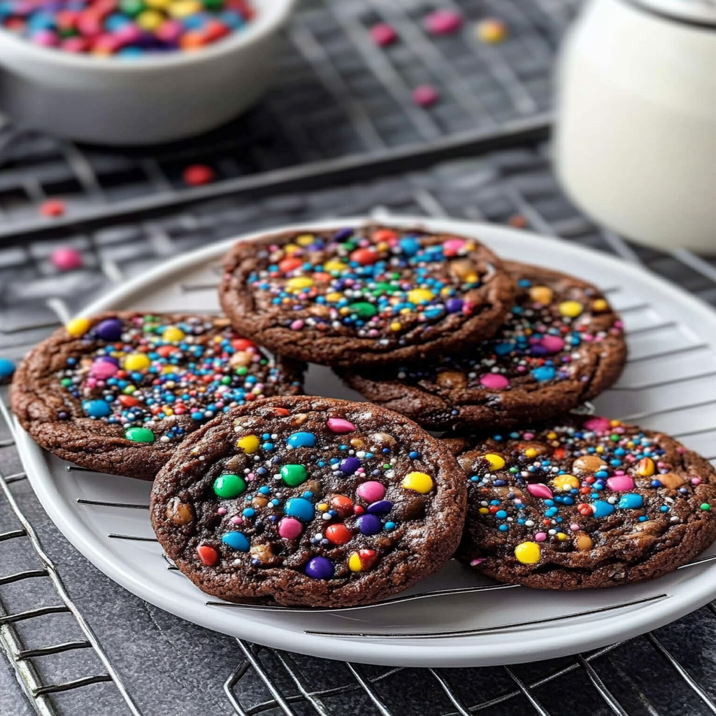 Indulge in the whimsical delight of Cosmic Brownie Cookies, a perfect blend of fudgy brownie flavor and chewy cookie texture. These irresistible treats are studded with semi-sweet chocolate chips and colorful rainbow sprinkles, making them a nostalgic favorite for both kids and adults. Whether you’re celebrating a special occasion or simply treating yourself on a Tuesday, these cookies are sure to bring joy to your day.
