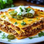 In conclusion, this Mexican lasagna recipe combines layers of savory flavors that everyone will love. With simple ingredients like ground meat, tortillas, and cheese, it’s easy to prepare yet impressively satisfying. Remember, this dish is versatile; feel free to customize it by adding your favorite veggies or using different types of beans. Whether you’re making it for a family dinner or a gathering with friends, this hearty meal will surely be a hit! Enjoy every bite!