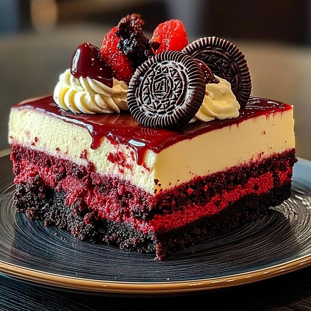 Red Velvet Oreo Cheesecake is a show-stopping dessert that beautifully combines the classic flavors of red velvet cake with rich, creamy cheesecake and a crunchy Oreo crust. This decadent treat features a velvety filling tinted a striking red, enhanced by the delightful crunch of crushed Oreos both in the crust and as a topping. Perfect for birthdays, celebrations, or cozy nights at home, this cheesecake not only captivates the eye but also delivers an explosion of flavor in every bite. With minimal prep time and straightforward instructions, even novice bakers can create this irresistible dessert. Whether served at parties or enjoyed as an indulgent snack, this Red Velvet Oreo Cheesecake is sure to impress everyone who tries it.