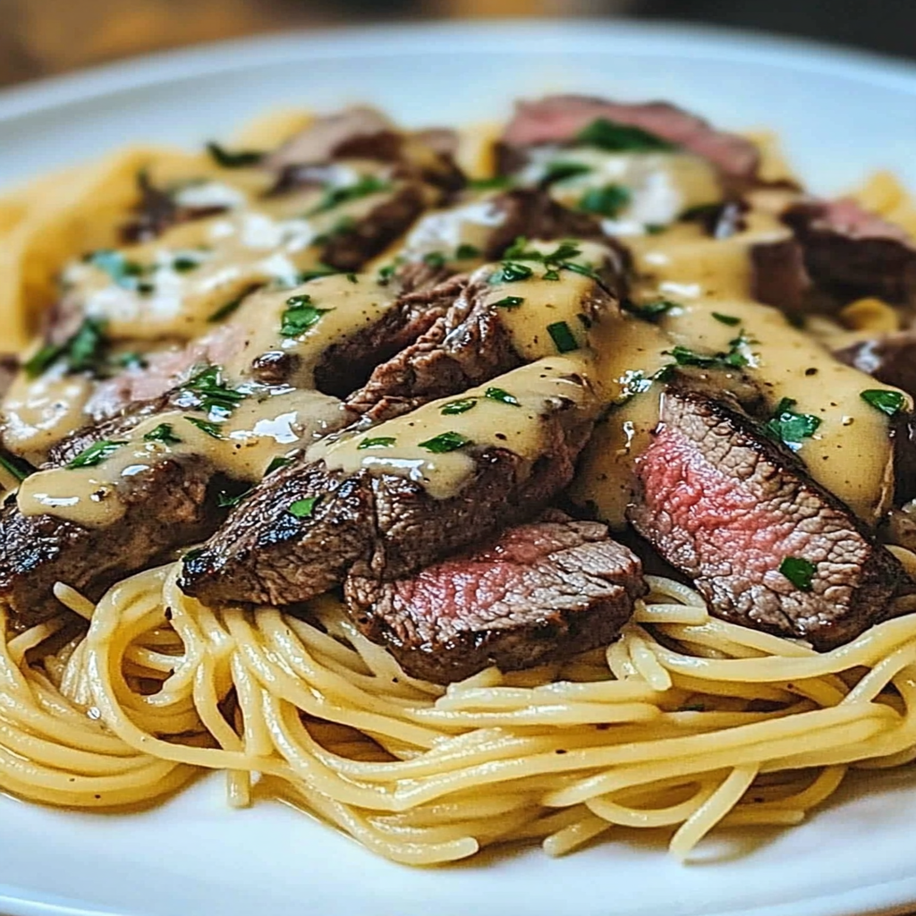 - Slice rested steak against the grain and serve over noodles, drizzling any remaining garlic butter sauce on top.